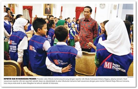 Sebanyak 46 repcil berkesempatan mewawancarai sang pemimpin negara, salah satu narasumber penulisan buku Pemimpin Masa Depan yang tengah mereka garap dan akan dibagikan ke perpustakaanperpustakaan SD. Sebelum berjumpa Jokowi, para repcil telah mewawancarai enam menteri Kabinet Kerja, mempraktikkan pelatihan yang mereka dapat seusai dinyatakan lolos seleksi.