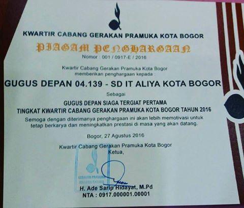 Alhamdulillah… prestasi kembali terukir  untuk Gugus Depan 04.139 SDIT Aliya Kota Bogor sebagai Gugus Depan Tergiat Pertama Tingkat Kwartir Cabang Gerakan Pramuka Kota Bogor Tahun 2016. Sedikitnya ada sebanyak 9 (sembilan) standar penilaian dan dievaluasi pada tanggal 26 Agustus 2016 oleh Tim asesor sebanyak 3 orang, yaitu: Ka Whe Wahyudin, Ka Hj. Sumiati dari unsur PUSDIKLATCAB n Ka Dedi S dari unsur Kwarcab kota Bogor.