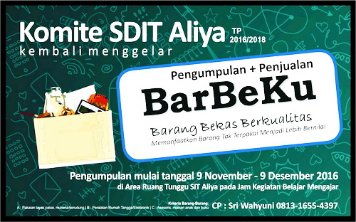 “Memanfaatkan Barang Tak Terpakai Menjadi Lebih Bernilai” merupakan tema kegiatan sosial bernama BarBeKu (Barang Bekas Berkualitas) yang digagas pertama kali pada tahun 2014 oleh komite SDIT Aliya bekerjasama dengan pihak sekolah. Kegiatan ini diawali dari pengumpulan dan menjual barang bekas hasil dari donasi para orang tua siswa kepada masyarakat sekitar termasuk karyawan SIT Aliya.