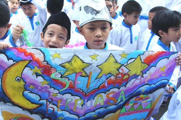 Anak-anak terlihat sangat antusias mengelilingi sekolah dalam kegiatan tarhib ini. Dengan berbekal poster yang sudah dibuat oleh mereka sebelumnya, mereka membagikan jadwal imsak kepada warga sekitar yang dilalui.