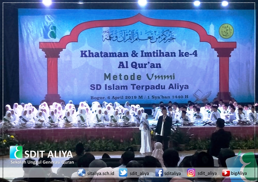 Alunan doa khotmul Qur’an mengiringi langkah siswa-siswi Aliya yang telah lulus mengikuti tahapan pembelajaran Ummi (Jilid 1 sampai Tajwid) serta lulus dalam Pra munaqosyah dan Munaqosyah yaitu ujian tertutup dengan materi Tartil, Fashohah, Gharibul Qur’an, Tajwid dan Tahfidz. Dengan bangga dan haru satu persatu siswa menaiki panggung acara Khataman dan Imtihan ke-4 Al Quran Metode Ummi di Gedung Kemuning Gading, Balai Kota Bogor, 6 April 2019. Para orang tua dan para tamu undangan ikut terharu dan bangga dengan putra-putri mereka dalam balutan busana putih-putih. Acara ini merupakan imtihan (uji terbuka) bagi para khatimin dan khatimat.