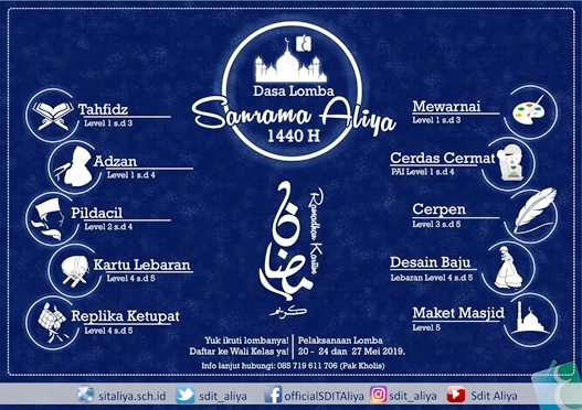 Dalam rangka memeriahkan kegiatan Pesantren Ramadhan 1440 H yang diselenggarakan mulai 8 s.d 27 Mei 2019, panitia telah mempersiapkan berbagai macam perlombaan yang akan dilaksanakan mulai tanggal 20 s.d 27 Mei 2019, yaitu: