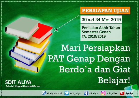 - Selama Pelaksanaan PAT, seluruh siswa (kelas I s.d. V) masuk pukul 07.30 dan pulang pukul 12.30 WIB. (Trans Aliya berlangsung menyesuaikan dengan jadwal).