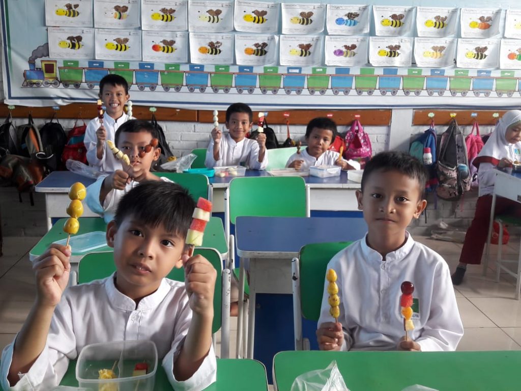 Menu dan kegiatan di setiap levelnya berbeda. Level satu membawa bekal buah atau minuman sehat, level dua membawa sate buah atau sate telur puyuh, level tiga membawa buah-buahan, level empat membawa sereal atau bubur kacang dan jasuke, level lima membawa salad, sop buah atau puding buah sedangkan level enam membawa buah dan infused water. Selain membawa bekal siswa juga mendengarkan penjelasan dari guru tentang kandungan gizi yang ada pada buah dan makanan yang mereka bawa. Dalam kegiatan ini hadir pula pembicara Yaitu dr. Rudi Satrya, SP.A yang merupakan orang tua dari ananda Ariq kelas 2B dan Alya kelas 4B dengan materi gizi seimbang. Alhamdulilah pengetahuan siswa tentang makanan bergizi bertambah. (Sri M)