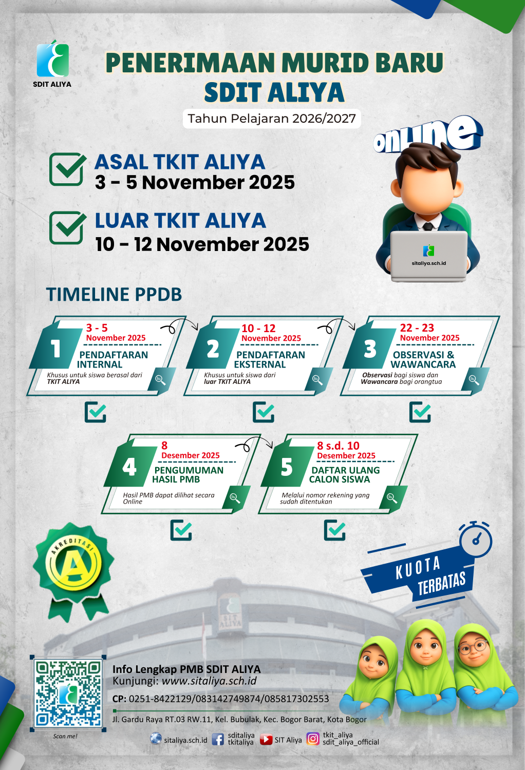 Penerimaan Murid Baru SDIT Aliya Tahun Pelajaran 2026/2027 membuka pendaftaran siswa baru sebanyak 112 kursi (empat kelas) dengan waktu pelaksanaan sebagai berikut: