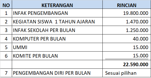 Catatan: Biaya di atas belum termasuk seragam dan layanan jasa (snack, catering dan jemputan) jika mengikuti